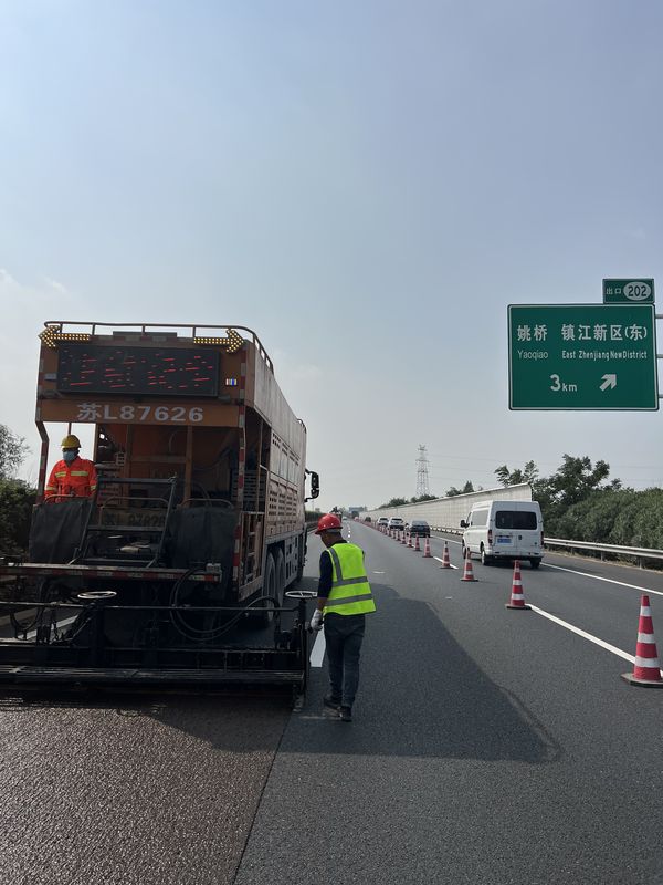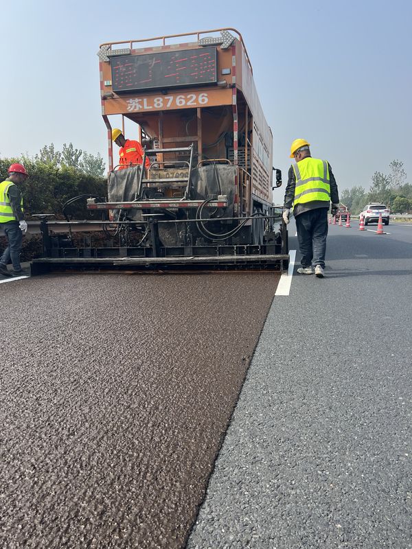 SBS高黏乳化瀝青冷拌冷鋪,單粘徑超薄低噪抗滑磨耗層施工現(xiàn)場(chǎng)。